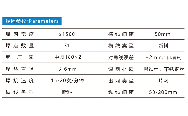 倉(cāng)儲(chǔ)籠&線纜橋架網(wǎng)焊接生產(chǎn)線,焊接網(wǎng)寬度≤1500mm,焊接絲徑3-6mm,焊接速度為15-20次/分鐘,縱線橫線均為斷料。河北驕陽(yáng)焊工有限公司,0318-7063097