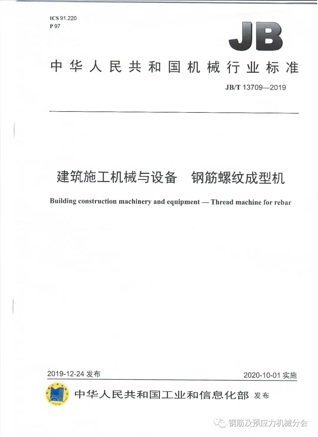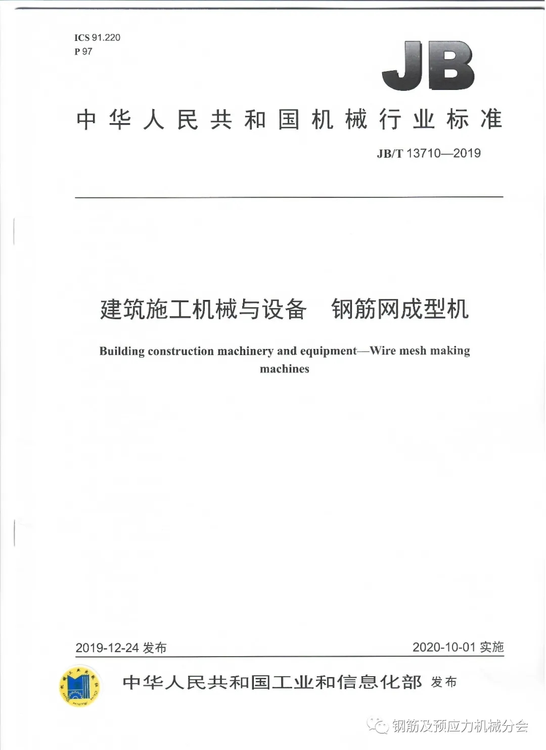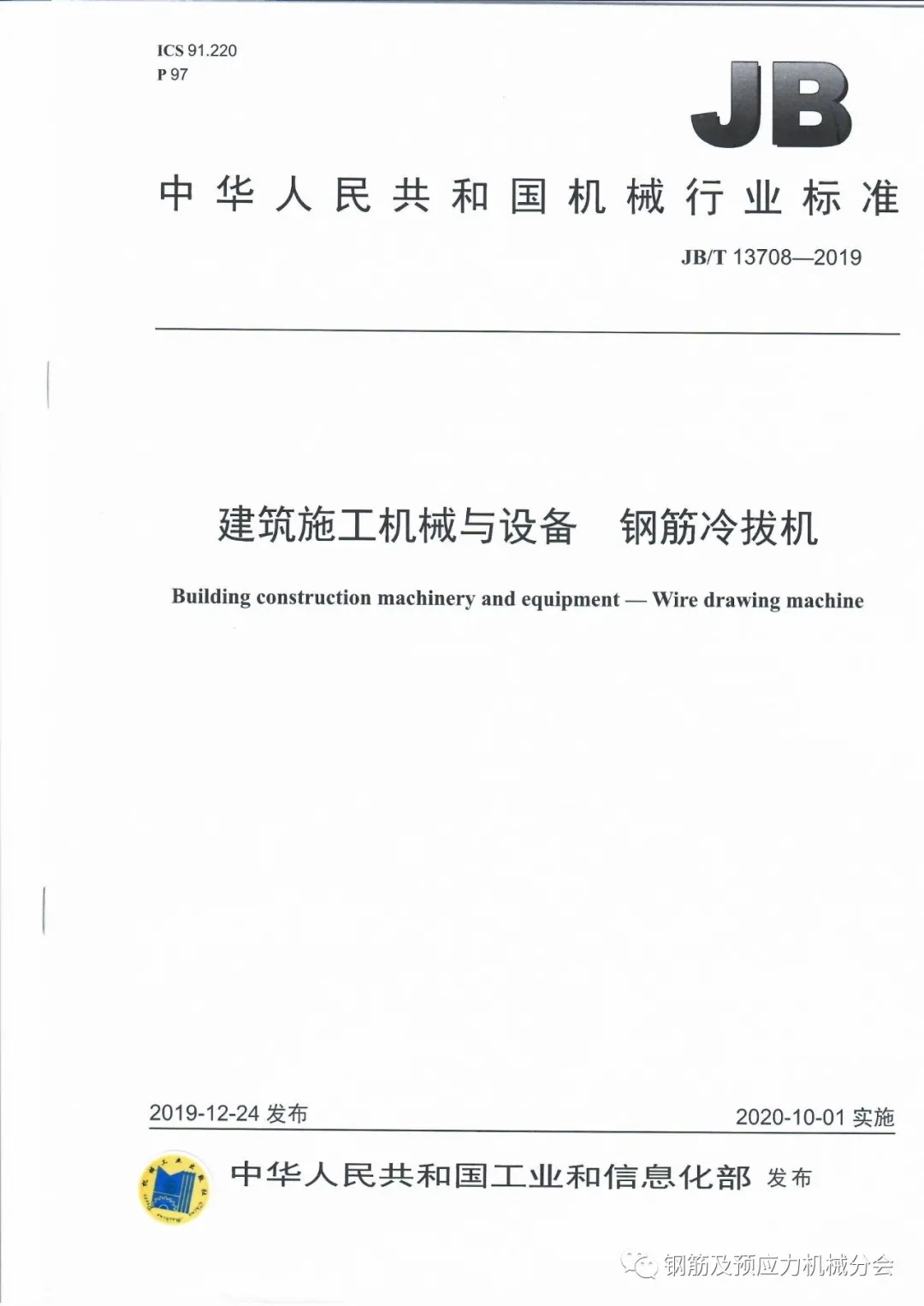 由中國建筑科學研究院有限公司建筑機械化研究分院起草、中國工程機械工業(yè)協(xié)會鋼筋及預應力機械分會等10余家單位參與編寫的《建筑施工機械與設備 鋼筋冷拔機》JG/T13708-2019標準、《建筑施工機械與設備 鋼筋螺紋成型機》JG/T13709-2019標準和《建筑施工機械與設備鋼筋網成型機》JG/T13710-2019標準自2020年10月01日起實施。