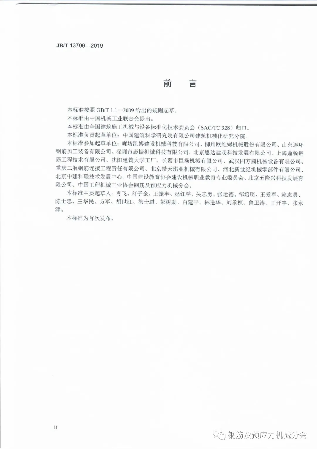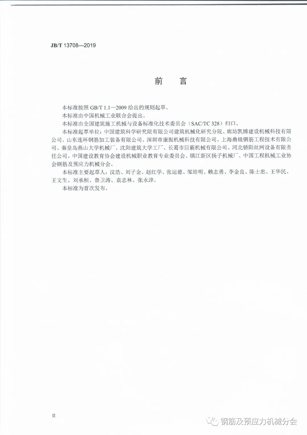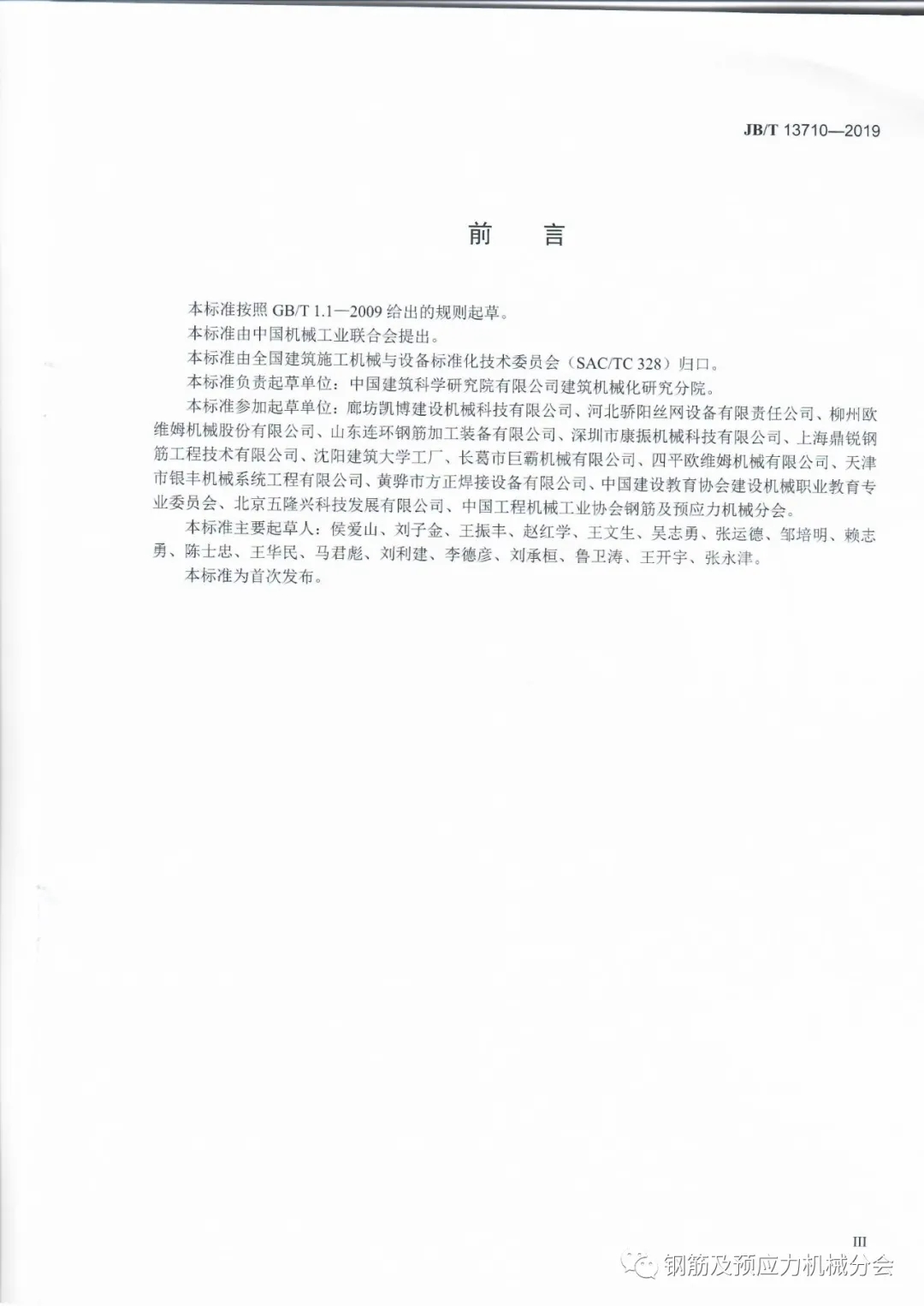 由中國建筑科學研究院有限公司建筑機械化研究分院起草、中國工程機械工業(yè)協(xié)會鋼筋及預應力機械分會等10余家單位參與編寫的《建筑施工機械與設備 鋼筋冷拔機》JG/T13708-2019標準、《建筑施工機械與設備 鋼筋螺紋成型機》JG/T13709-2019標準和《建筑施工機械與設備鋼筋網成型機》JG/T13710-2019標準自2020年10月01日起實施。